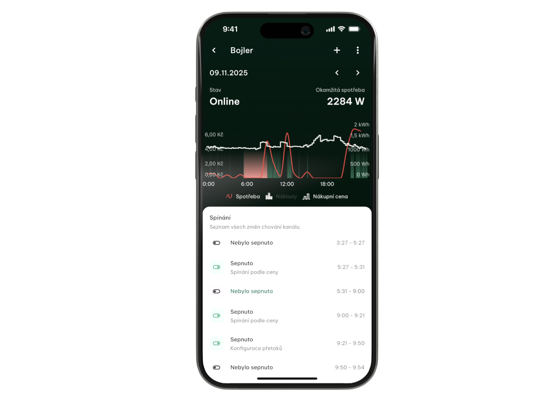 Nejvýznamnější funkcionalita toho updatu. U zařízení jako bojlery, wallboxy nebo topné žebříky nově najdete kompletní detail spínání, který obsahuje: